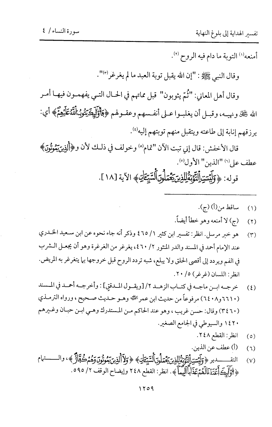قوله: {وَلَيْسَتِ التوبة لِلَّذِينَ يَعْمَلُونَ السيئات} الآية.