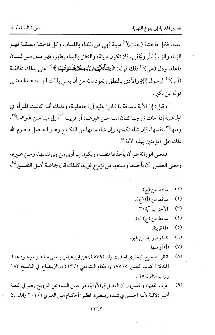 عليه، فكل فاحشة (نعتت) مبينة فهي من البَذاء باللسان، وكل فاحشة مطلقة فهو الزنا، والزنا يُسْتَر ويَخفى، فلا تكون مبينة، والنطق بالبذاء يظهر، فهو مبين من لسان فاعله، ودل (على) ذلك قوله: {يانسآء النبي مَن يَأْتِ مِنكُنَّ بِفَاحِشَةٍ مُّبَيِّنَةٍ} [الأحزاب: 30] عنى بذلك مخالفة (أمر) الرسول A والأذى بالنطق ونعوذ بالله من أن يعني بذلك أنه كانت المرأة في الجاهلية إذا مات زوجها كان ابنه من غيرها، أو قريبه أولى بها من غيرهما، ومنه بنفسها، فإن شاء نكحها وإن شاء منعها من التكاح وهو العضل فحرم الله ذلك على المؤمنين بهذه الآية.