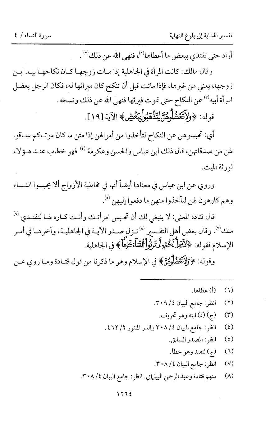 قال قتادة المعنى: لا ينبغي لك أن تحبس امرأتك وأنت كاره لها لتفتدي منك. وقال بعض أهل التفسير نزل صدر الآية في الجاهلية، وآخرها في أمر الإسلام فقوله: {لاَ يَحِلُّ لَكُمْ أَن تَرِثُواْ النسآء كَرْهاً} في الجاهلية.