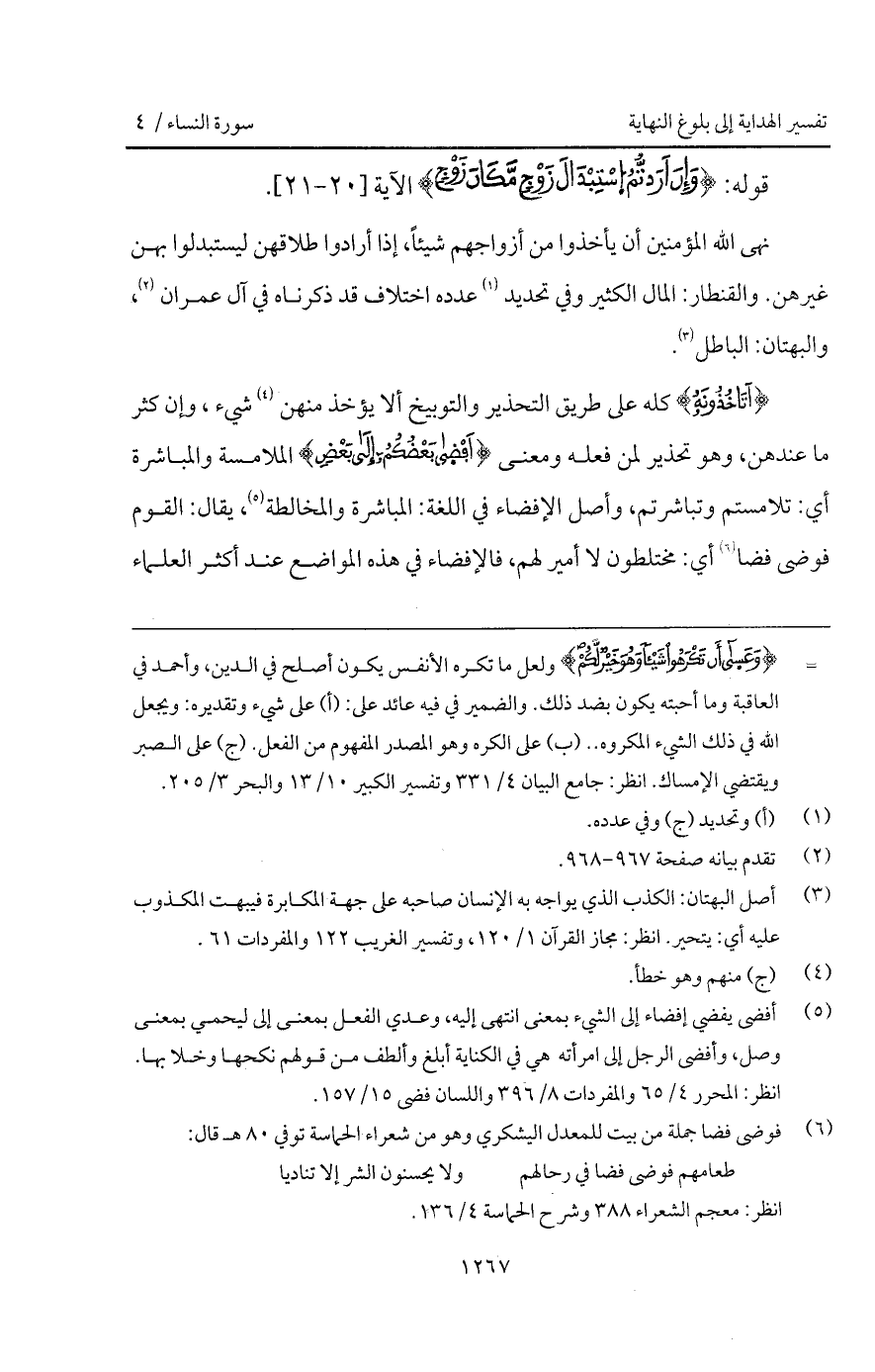 نهى الله المؤمنين أن يأخذوا من أزواجهم شيئاً، وإذا أرادوا طلاقهن ليستبدلوا بهن غيرهن. والقنطار: المال الكثير وفي تحديد عدده اختلاف قد ذكرناه في آل عمران، والبهتان: الباطل: