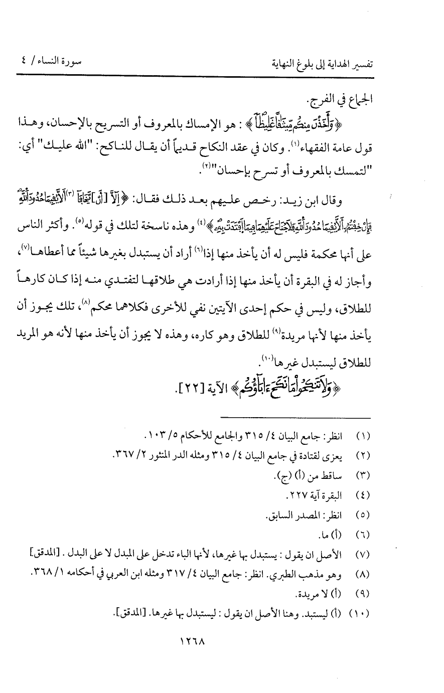 وقال ابن زيد: رخص عليهم بعد ذلك فقال: {إِلاَّ [أَن] يَخَافَآ أَلاَّ يُقِيمَا حُدُودَ الله فَإِنْ خِفْتُمْ أَلاَّ يُقِيمَا حُدُودَ الله فَلاَ جُنَاحَ عَلَيْهِمَا فِيمَا افتدت بِهِ} [البقرة: 229] وهذه ناسخة لتلك في قوله. وأكثر الناس على أنها محكمة فليس له أن يأخذ منها إذا أراد أن يستبدل بغيرها شيئاً مما أعطاها، وأجاز له في البقرة أن يأخذ منها إذا أرادت هي طلاقها لتفتدي منه إذا كان كارهاً للطلاق، وليس في حكم إحدى الآيتين نفي للأخرى فكلاهما محكم، تلك يجوز أن يأخذ منها لأنها مريدة للطلاق وهو كاره، وهذه لا يجوز أن يأخذ منها لأنه هو المريد للطلاق ليستبدل غيرها.