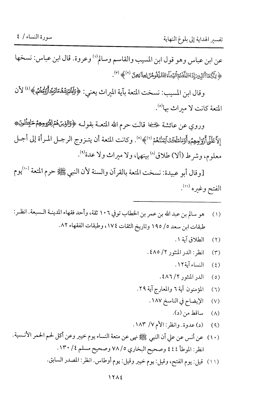[وقال أبو عبيدة: نسخت المتعة بالقرآن والسنة لأن النبي A حرم المتعة يوم الفتح وغيره.