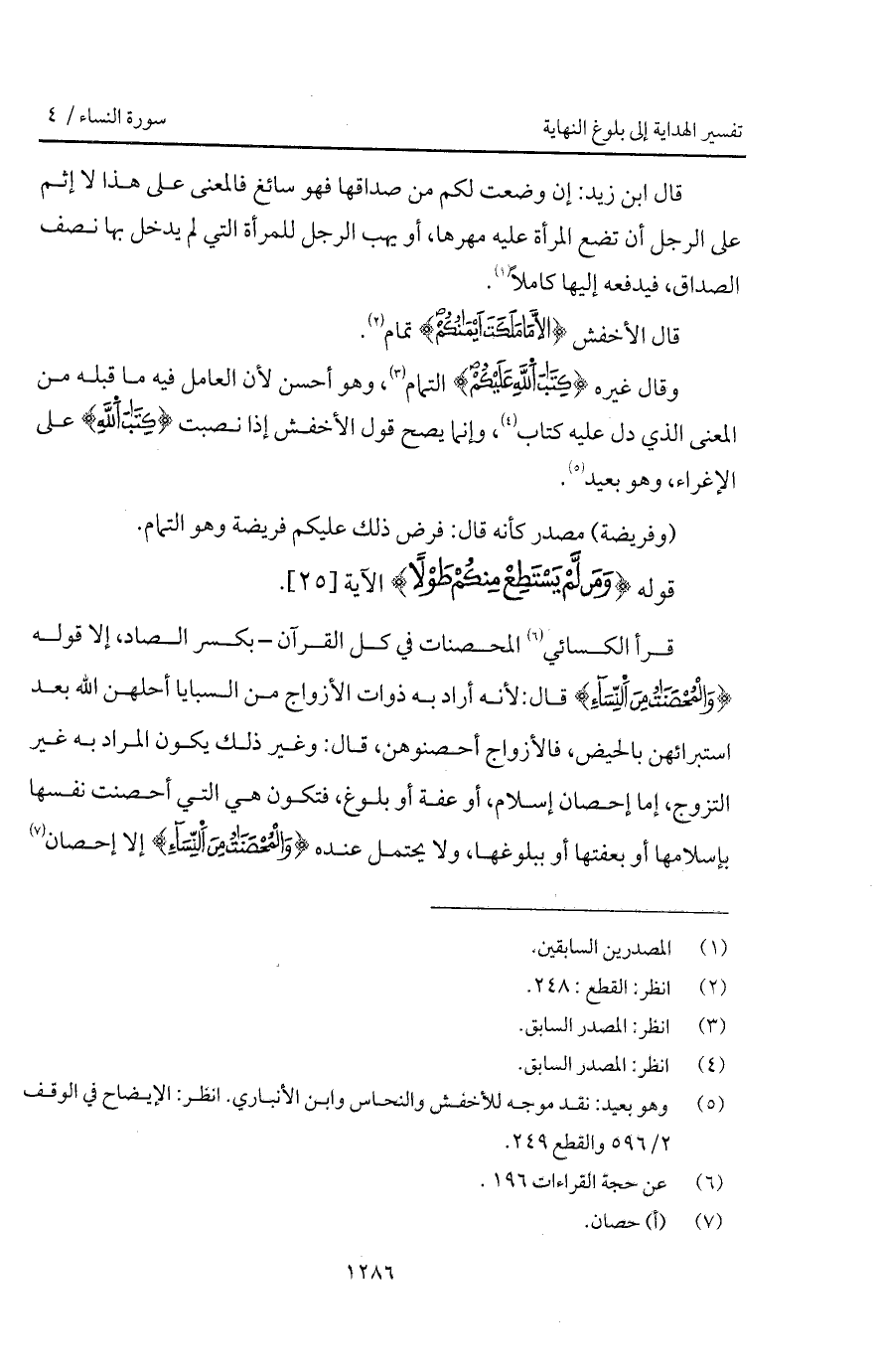 قرأ الكسائي المحصنات في كل القرآن - بكسر الصاد، إلا قوله {والمحصنات مِنَ النسآء} قال: لأنه أراد به ذوات الأزواج من السبايا أحلهن الله بعد استبرائهن بالحيض، فالأزواج أحصنوهن، قال: وغير ذلك يكون المراد به غير التزوج، إما إحصان إسلام، أو عفة أو بلوغ، فتكون هي التي أحصنت نفسها بإسلامها أو بعفتها أو ببلوغها، ولا يحتمل عنده {والمحصنات مِنَ النسآء} إلا إحصان