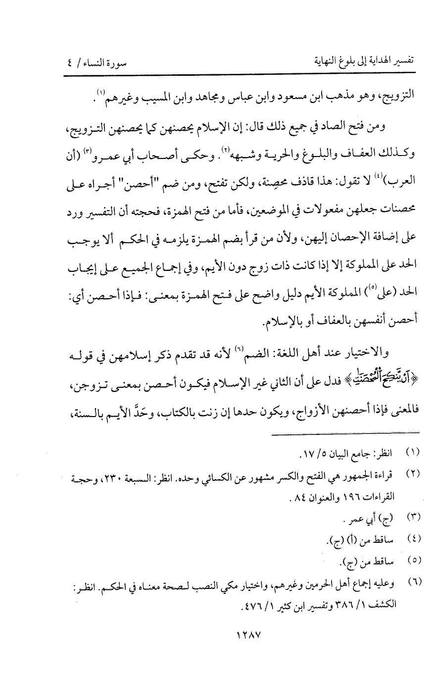 ومن فتح الصاد في جميع ذلك قال: إن الإسلام يحصنهن كما يحصنهن التزويج، وكذلك العفاف والبلوغ والحرية وشبهه. وحكى أصحاب أبي عمرو (أن العرب) لا تقول: هذا قاذف محصِنة، ولكن تفتح، ومن ضم " أحصن " أجراه على محصنات جعلهن مفعولات في الموضعين، فأما من فتح الهمزة، فحجته أن التفسير ورد على إضافة الإحصان إليهن، ولأن من قرأ بضم الهمزة يلزمه في الحكم ألا يوجب الحد على المملوكة إلا إذا كانت ذات زوج دون الأيم، وفي إجماع الجميع على إيجاب الحد (على) المملوكة الأيم دليل واضح على فتح الهمزة بمعنى: فإذا أحصن أي: أحصن أنفسهن بالعفاف أو بالإسلام.