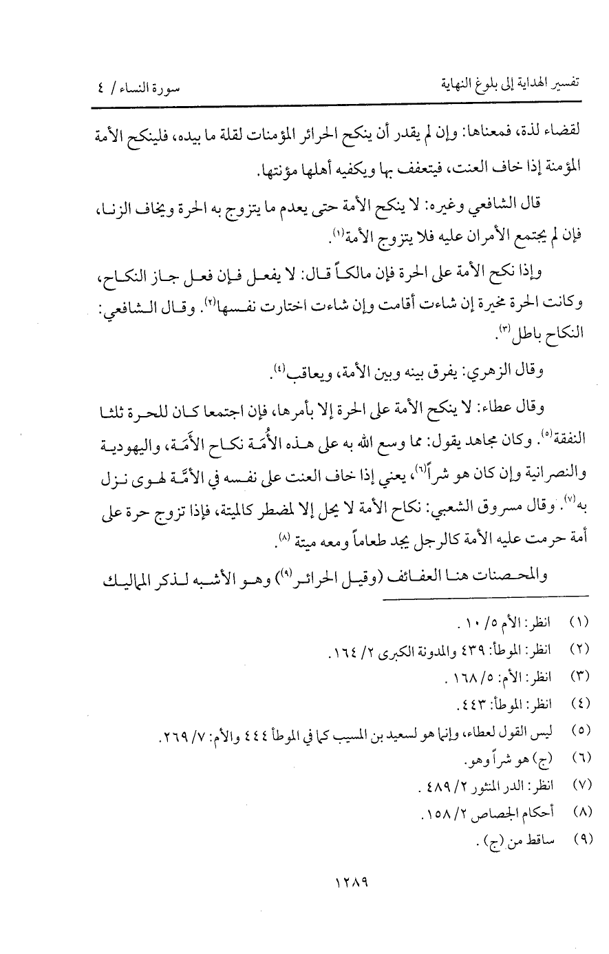 وقال عطاء: لا ينكح المة على الحرة إلا بأمرها، فإن اجتمعا كان للحرة ثلثا النفقة. وكان مجاهد يقول: مما وسع الله به على هذه الأُمَة نكاح الأَمَة، واليهودية والنصرانية وإن كان هو شراً، يعني إذا خاف العنت على نفسه في الأمَّة لهوى نزل به. وقال مسروق الشعبي: نكاح الأمة لا يحل إلا لمضطر كالميتة، فإذا تزوج حرة على أمة حرمت عليه الأمة كالرجل يجد طعاماً ومعه ميتة.