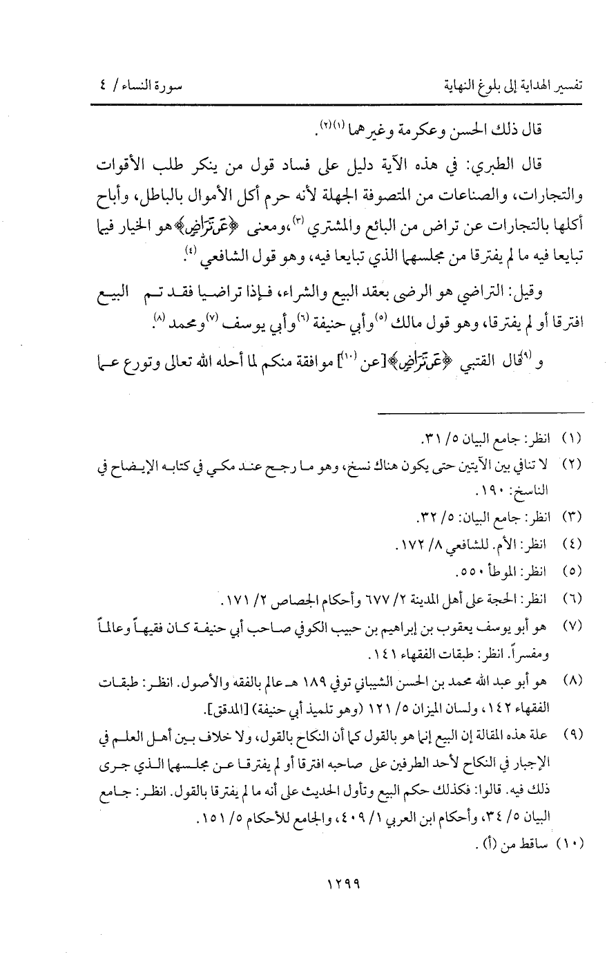 قال الطبري: في هذه الآية دليل على فساد قوله من ينكر طلب الأقوات والتجارات، والصناعات من المتصوفة الجهلة لأنه حرم أكل الأموال بالباطل، وأباح أكلها بالتجارات عن تراض من البائع والمشتري، ومعنى {عَن تَرَاضٍ} هو الخيار فيما تبايعا فيه ما لم يفترقا من مجلسهما الذي تبايعا فيه، وهو قول الشافعي.