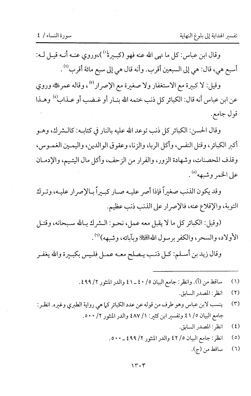 وقال ابن عباس: كل ما نهى الله عنه فهو (كبيرة)، وروي عنه أنه قيل له: أسبع هي، قال: هي إلى السبعين أقرب. وأنه قال هي إلى سبع مائة أقرب.