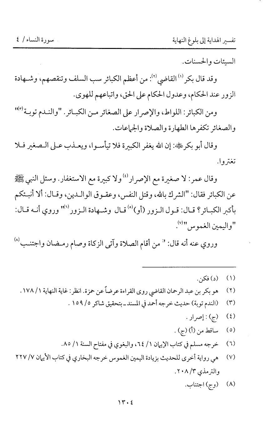وقال عمر: لا صغيرة مع الإصرار ولا كبيرة مع الاستغفار. و " سئل النبي A عن الكبائر فقال: " الشرك بالله، وقتل النفس، وعقوق الوالدين، وقال: ألا أنبئكم بأكبر الكبائر؟ قال: قوله الزور (أو) قال وشهادة الزور " وروي أنه قال: " اليمين الغموس ".