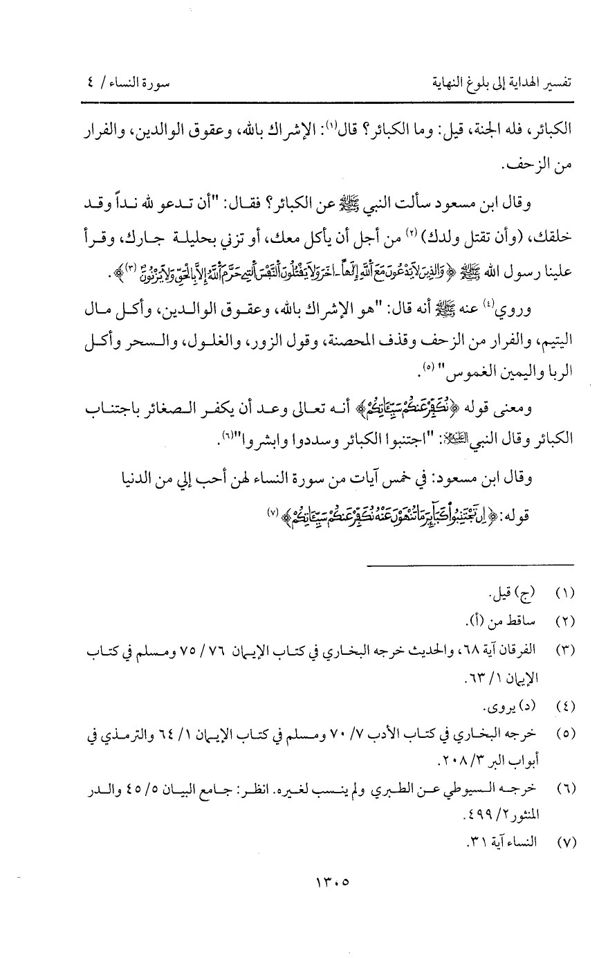وقال ابن مسعود " سألت النبي A عن الكبائر؟ فقال: " أن تدعو لله نداً وقد خلقك، (وأن تقتل ولدك) من أجل أن يأكل معك، أو تزني بحليلة جارك، وقرأ علينا رسول الله A { والذين لاَ يَدْعُونَ مَعَ الله إلها آخَرَ وَلاَ يَقْتُلُونَ النفس التي حَرَّمَ الله إِلاَّ بالحق وَلاَ يَزْنُونَ} [الفرقان: 68] ".