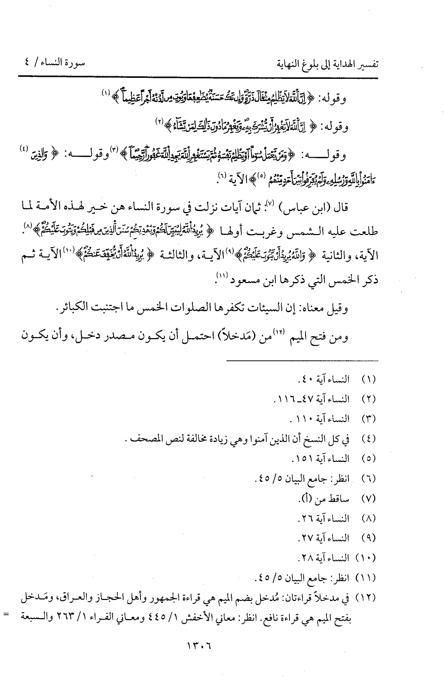 قال (ابن عباس): ثمان آيات نزلت في سورة النساء هن خير لهذه الأمة لما طلعت عليه الشمس وغربت أولها {يُرِيدُ الله لِيُبَيِّنَ لَكُمْ وَيَهْدِيَكُمْ سُنَنَ الذين مِن قَبْلِكُمْ وَيَتُوبَ عَلَيْكُمْ} [النساء: 26]. الآية، والثانية {والله يُرِيدُ أَن يَتُوبَ عَلَيْكُمْ} [النساء: 27] الآية، والثالثة {يُرِيدُ الله أَن يُخَفِّفَ عَنْكُمْ} [النساء: 28] الآية ثم ذكر الخمس التي ذكرها ابن مسعود.