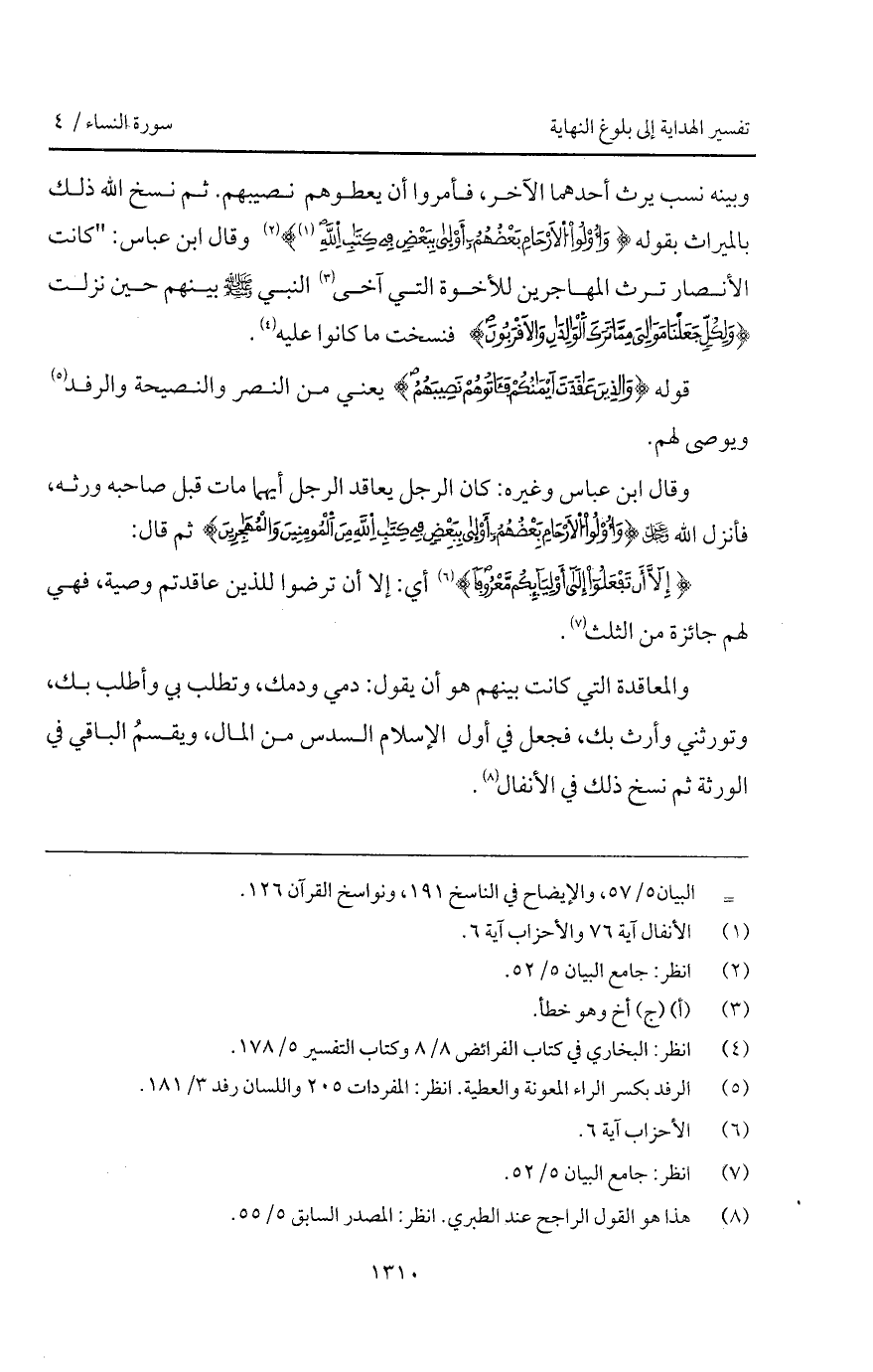 وبينه نسب يرث أحدهما الآخر، فأمروا أن يعطوهم نصيبهم. ثم نسخ الله ذلك بالميراث بقوله {وَأْوْلُواْ الأرحام بَعْضُهُمْ أولى بِبَعْضٍ فِي كِتَابِ الله} [الأنفال: 75، والأحزاب: 6] وقال ابن عباس: " كانت الأنصار ترث المهاجرين للأخوة التي آخى النبي A بينهم حين نزلت {وَلِكُلٍّ جَعَلْنَا موالي مِمَّا تَرَكَ الوالدان والأقربون} فنسخت ما كانوا عليه.