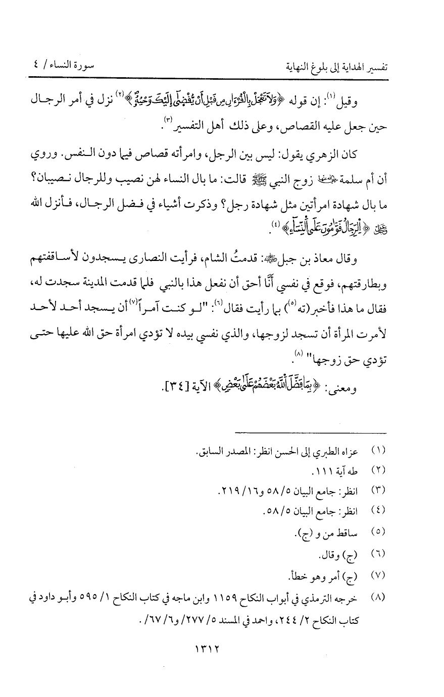 كان الزهري يقول: ليس بين الرجل، وامرأته قصاص فيما دون النفس. وروي أن أم سلمة Bها زوج النبي A قالت: ما بال النساء لهن نصيب وللرجال نصيبان؟ ما بال شهادة امرأتين مثل شهادة رجل؟ وذكرت أشياء في فضل الرجال، فأنزل الله D { الرجال قوامون عَلَى النسآء}.