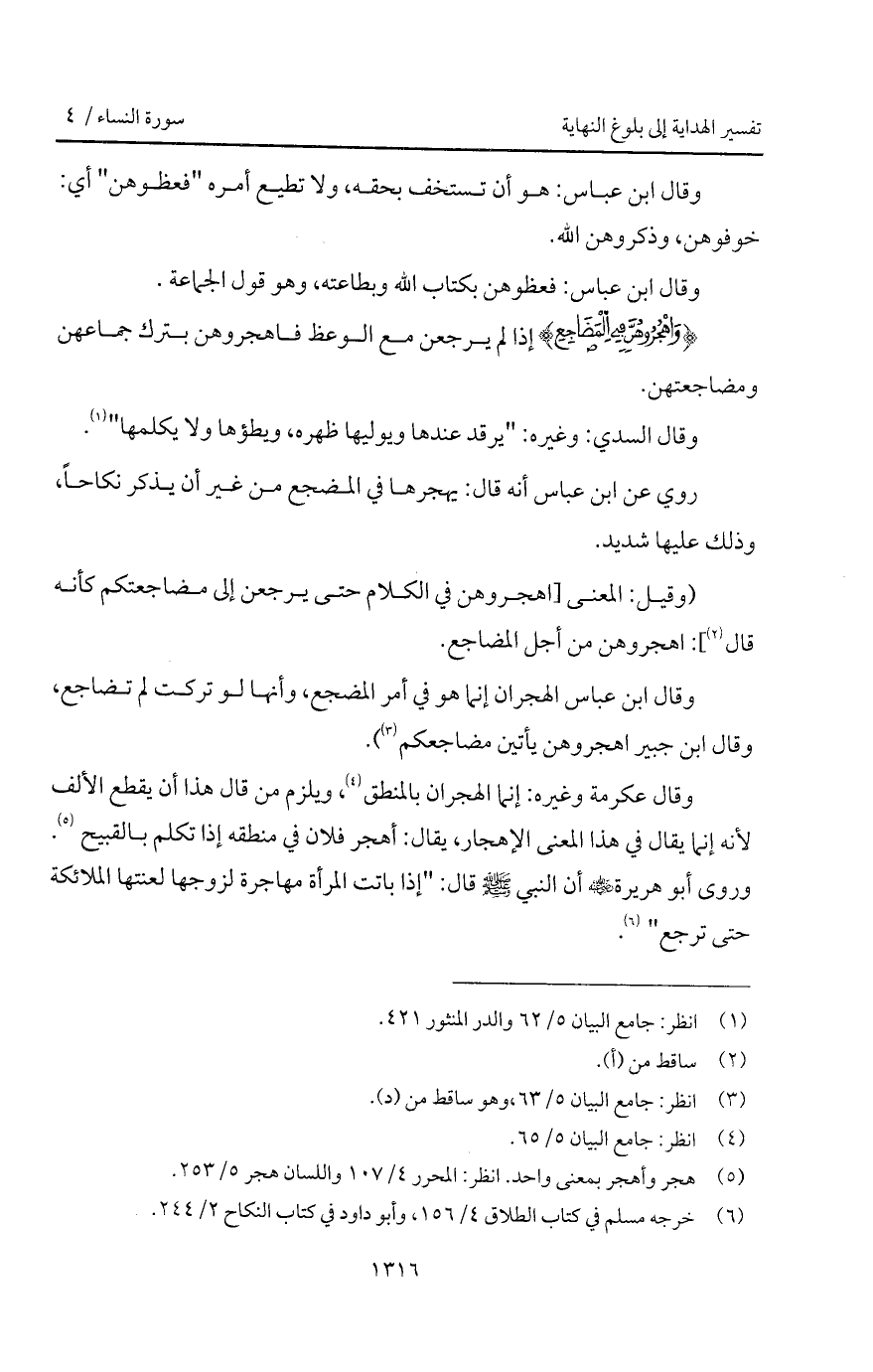 وقال عكرمة وغيره: إنما الهجران بالمنطق، ويلزم من قال هذا أن يقطع الألف لأنه إنما يقال في هذا المعنى الإهجار، يقال: أهجر فلان في منطقه إذا تكلم بالقبيح. وروى أبو هريرة Bهـ أن النبي A قال: " إذا باتت المرأة مهاجرة لزوجها لعنتها الملائكة حتى ترجع ".