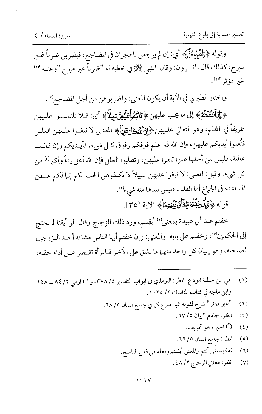 وقوله {واضربوهن} أي: إن لم يرجعن بالهجران في المضاجع، فيضربن ضرباً غير مبرح، كذلك قال المفسرون: وقال النبي A في خطبة له " ضرباً غير مبرح " وعنه " غير مؤثر ".