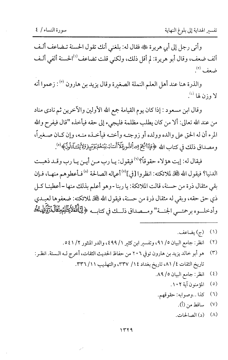 فيقال له: إيت هؤلاء حقوقاً؟ فيقول: يا رب من أين يا رب وقد ذهبت الدنيا؟ فيقول الله D لملائكته: انظروا [في] أعمله الصالحة فأعطوهم منها، فإن بقي مثقال ذرة من حسنة، قالت الملائكة: يا ربنا - وهو أعلم بذلك منها - أعطينا كل ذي حق حقه، وبقي له مثقال ذرة من حسنة، فيقول الله D لملائكته: ضعفوها لعبدي وأدخلوه برحمتي الجنة " ومصداق ذلك في كتابه {إِنَّ الله لاَ يَظْلِمُ مِثْقَالَ ذَرَّةٍ وَإِن تَكُ