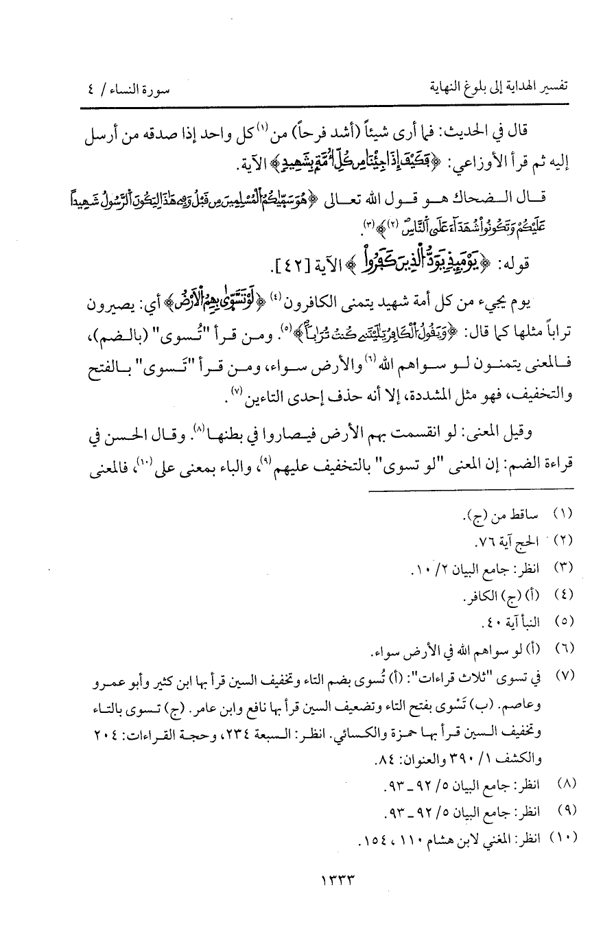 يوم يجيء من كل أمة شهيد يتمنى الكافرون {لَوْ تسوى بِهِمُ الأرض} أي: يصيرون تراباً مثلها كما قال: {وَيَقُولُ الكافر ياليتني كُنتُ تُرَاباً} [النبأ: 40]. ومن قرأ " تُسوى " (بالضم)، فالمعنى يتمنون لو سواهم الله والأرض سواء، ومن قرأ " تَسوى " بالفتح والتخفيف، فهو مثل المشددة، إلا أنه حذف إحدى التاءين.