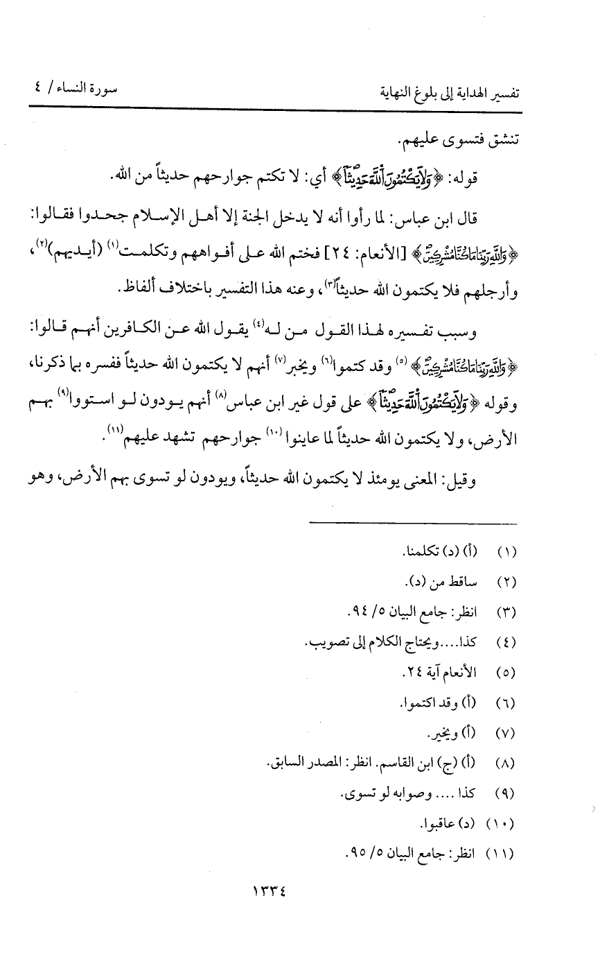 وسبب تفسيره لهذا الهذا القول من له يقول الله عن الكافرين أنهم قالوا: {والله رَبِّنَا مَا كُنَّا مُشْرِكِينَ} [الأنعام: 23] وقد كتموا ويخبر أنهم لا يكتمون الله حديثاً ففسره بما ذكرنا، وقوله {وَلاَ يَكْتُمُونَ الله حَدِيثاً} على قول غير ابن عباس أنهم يودون لو استووا بهم الأرض، ولا يكتمون الله حديثاً لما عاينوا جوارحهم تشهد عليهم.