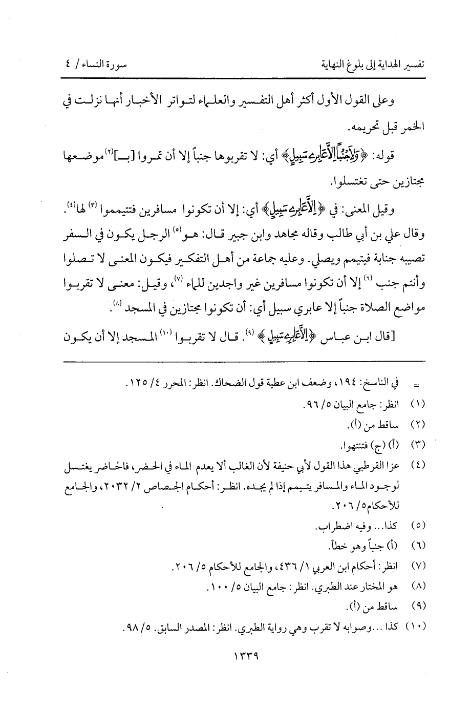 وقيل المعنى: في {إِلاَّ عَابِرِي سَبِيلٍ} أي: إلا أن تكونوا مسافرين فتتيمموا لها. وقال علي بن أبي طالب وقاله مجاهد وابن جبير قال: هو الرجل يكون في السفر تصيبه جنابة فيتيمم ويصلي. وعليه جماعة من أهل التفكير فيكون المعنى لا تصلوا وأنتم جنب إلا تكونوا مسافرين غير واجدين للماء، وقيل: معنى لا تقربوا مواضع الصلاة جنباً إلا عابري سبيل أي: أن تكونوا مجتازين في المسجد.