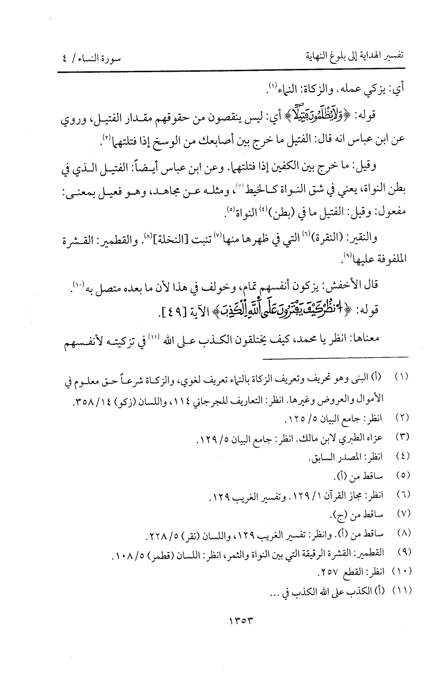 والنقير: (النقرة) التي في ظهرها منها تنبت [النخلة]. والقطمير: القشرة الملفوفة عليها.