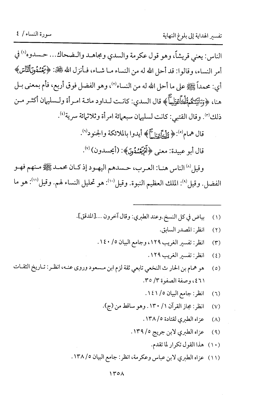 الناس: يعني قريشاً، وهو قول عكرمة والسدي ومجاهد والضحاك. . . حسدوه في أمر النساء، وقالوا: قد أحل الله له من النساء ما شاء، فأنزل الله D: { يَحْسُدُونَ الناس} أي: محمداً A على ما أحل الله له من النساء، وهو الفضل فوق أربع، فأم بمعنى بل هنا، {وَآتَيْنَاهُمْ مُّلْكاً عَظِيماً} قال السدي: كانت لداود مائة امرأة ولسليمان أكثر من ذلك. وقال القتبي: كانت لسليمان سبعمائة امرأة وثلاثمائة سرية.