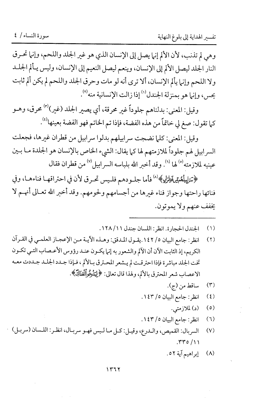 {سَرَابِيلُهُم مِّن قَطِرَانٍ} [إبراهيم: 50] فأما جلودهم فليس تحرق لأن في احتراقها فناءها، وفي فنائها راحتها وجواز فناء غيرها من أجسامهم ولحومهم. وقد أخبر الله تعالى أنهم لا يخفف عنهم ولا يموتون.