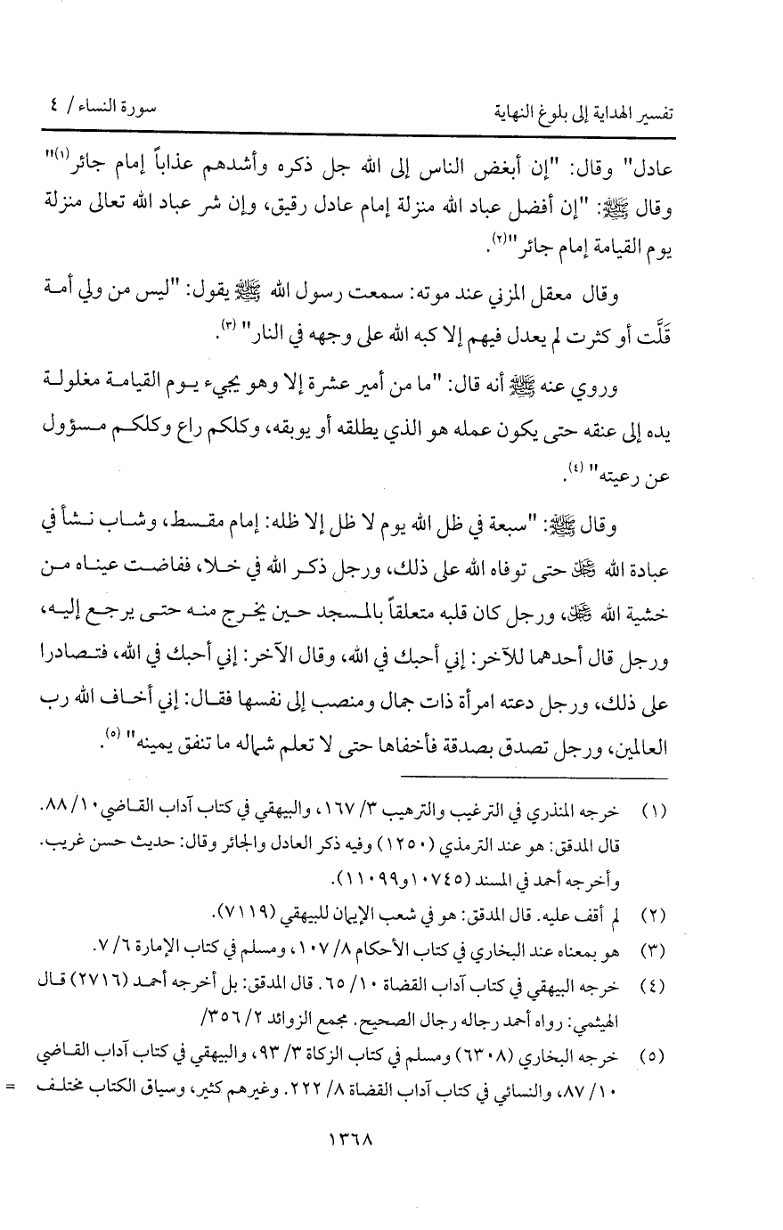 وقال - صلى الله عليه وسلم -: " سبعة في ظل الله يوم لا ظل إلا ظله: إمام مقسط، وشاب نشأ في عبادة الله - عز وجل - حتى توفاه الله على ذلك، ورجل ذكر الله في خلا، ففاضت عيناه من خشية الله - عز وجل -، ورجل كان قلبه متعلقاً بالمسجد حين يخرج منه حتى يرجع إليه، ورجل قال أحدهما للآخر: إني أحبك في الله، وقال الآخر: إني أحبك في الله، فتصادرا على ذلك، ورجل دعته امرأة ذات جمال ومنصب إلى نفسها فقال: إني أخاف الله رب العالمين، ورجل تصدق بصدقة فأخفاها حتى لا تعلم شماله ما تنفق يمينه ".