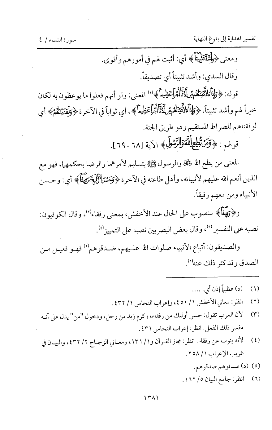 المعنى من يطع الله D والرسول A بتسليم لأمرهما والرضا بحكمهما، فهو مع الذين أنعم الله عليهم لأنبيائه، وأهل طاعته في الآخرة {وَحَسُنَ أولئك رَفِيقاً} أي: وحسن الأنبياء ومن معهم رفيقاً.