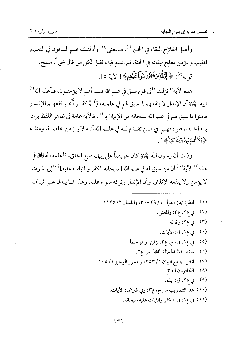 هذه الآية نزلت في قوم سبق في علم الله فيهم أنهم لا يؤمنون، فأعلم الله نبيه A أن الإنذار لا ينفعهم لما سبق لهم في علمه، وَثَمَّ كفار أُخَر نفعهم الإنذار فآمنوا لما سبق لهم في علم الله سبحانه من الإيمان به، فالآية عامة في ظاهر اللفظ يراد به الخصوص، فهي في من تقدم له في علم الله أنه لا يؤمن خاصة، ومثله {وَلاَ أَنتُمْ عَابِدُونَ مَآ أَعْبُدُ} [الكافرون: 3].