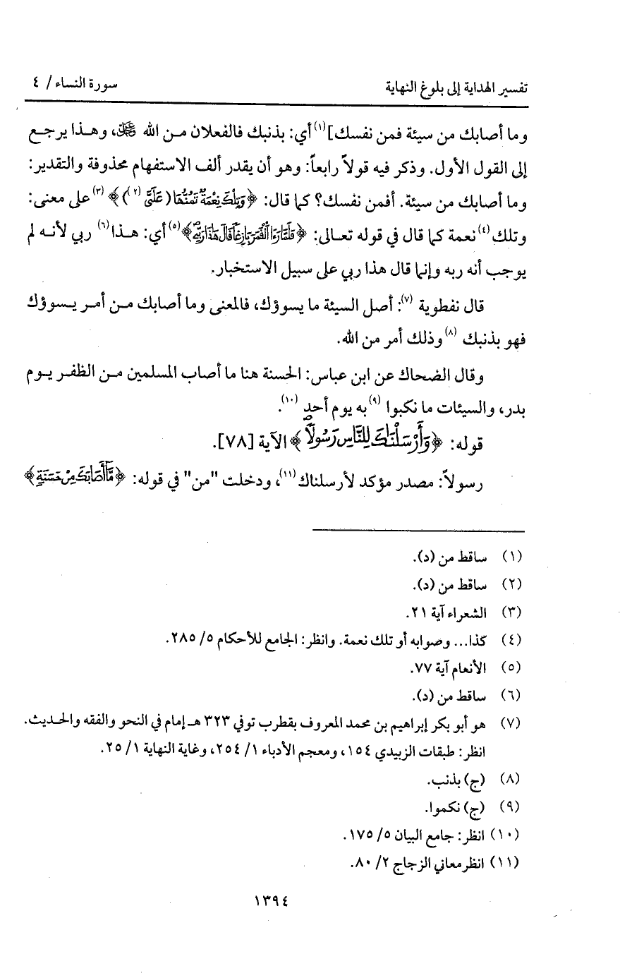 وما أصابك من سيئة فمن نفسك] أي: بذنبك فالفعلان من الله D، وهذا يرجع إلى القول الأول. وذكر فيه قولاً رابعاً: وهو أن يقدر ألف الاستفهام محذوفة والتقدير: وما أصابك من سيئة. أفمن نفسك؟ كما قال: {وَتِلْكَ نِعْمَةٌ تَمُنُّهَا (عَلَيَّ)} [الشعراء: 22] على معنى: وتلك نعمة كما قال في قوله تعالى: {فَلَماَّ رَأَى الشمس بَازِغَةً قَالَ هذا رَبِّي} [الأنعام: 78] أي: هذا ربي لأنه لم يوجب أنه ربه وإنما قال هذا ربي على سبيل الاستخبار.