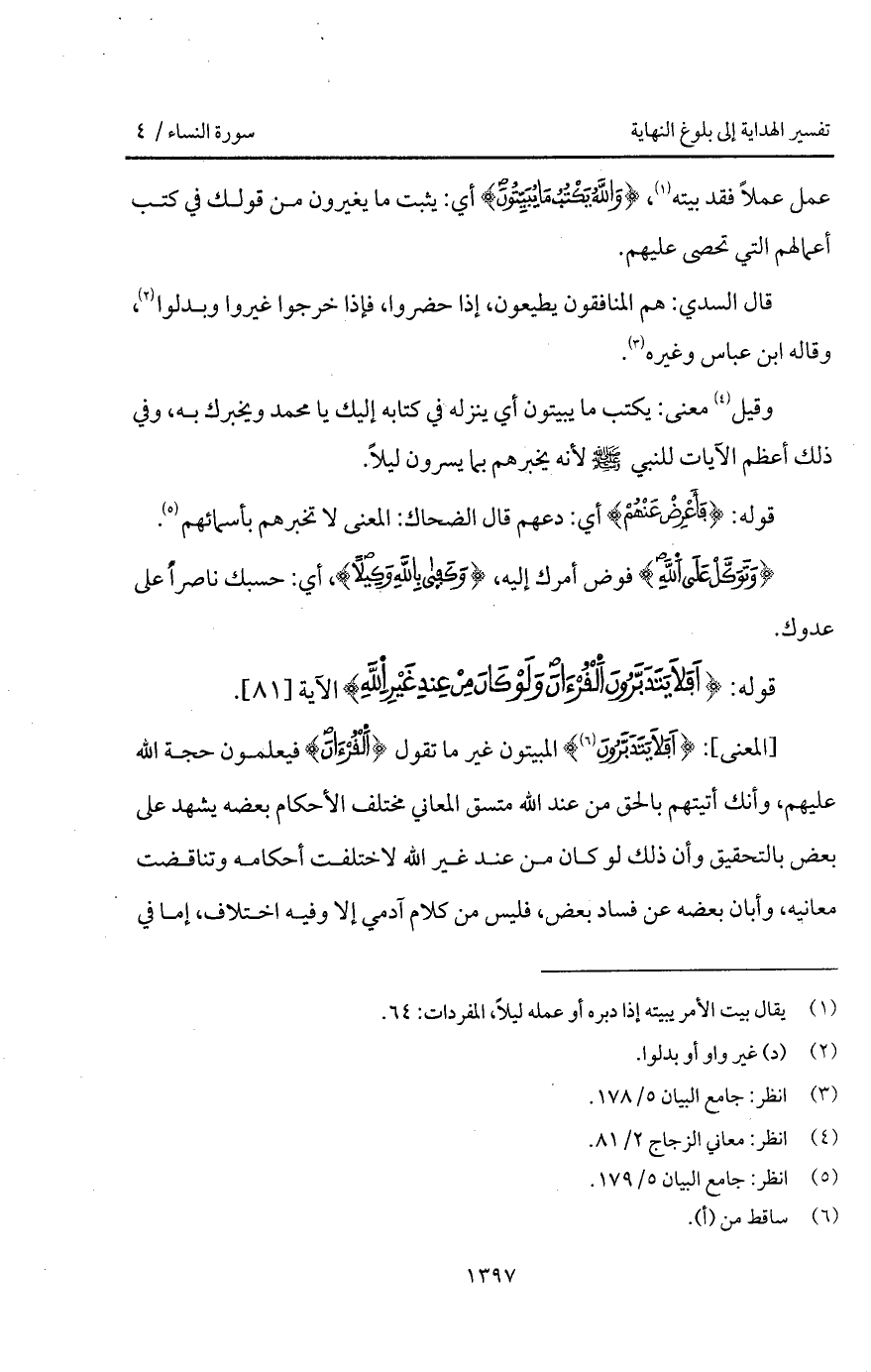 [المعنى]: {أَفَلاَ يَتَدَبَّرُونَ} المبيتون غير ما تقول {القرآن} فيعلمون حجة الله عليهم، وأنك أتيتهم بالحق من عند الله متسق المعاني مختلف الأحكام بعضه يشهد على بعض بالتحقيق وأن ذلك لو كان من عند غير الله لاختلفت أحكامه وتناقضت معانيه، وأبان بعضه عن فساد بعض، فليس من كلام آدمي إلا وفيه اختلاف، إما في