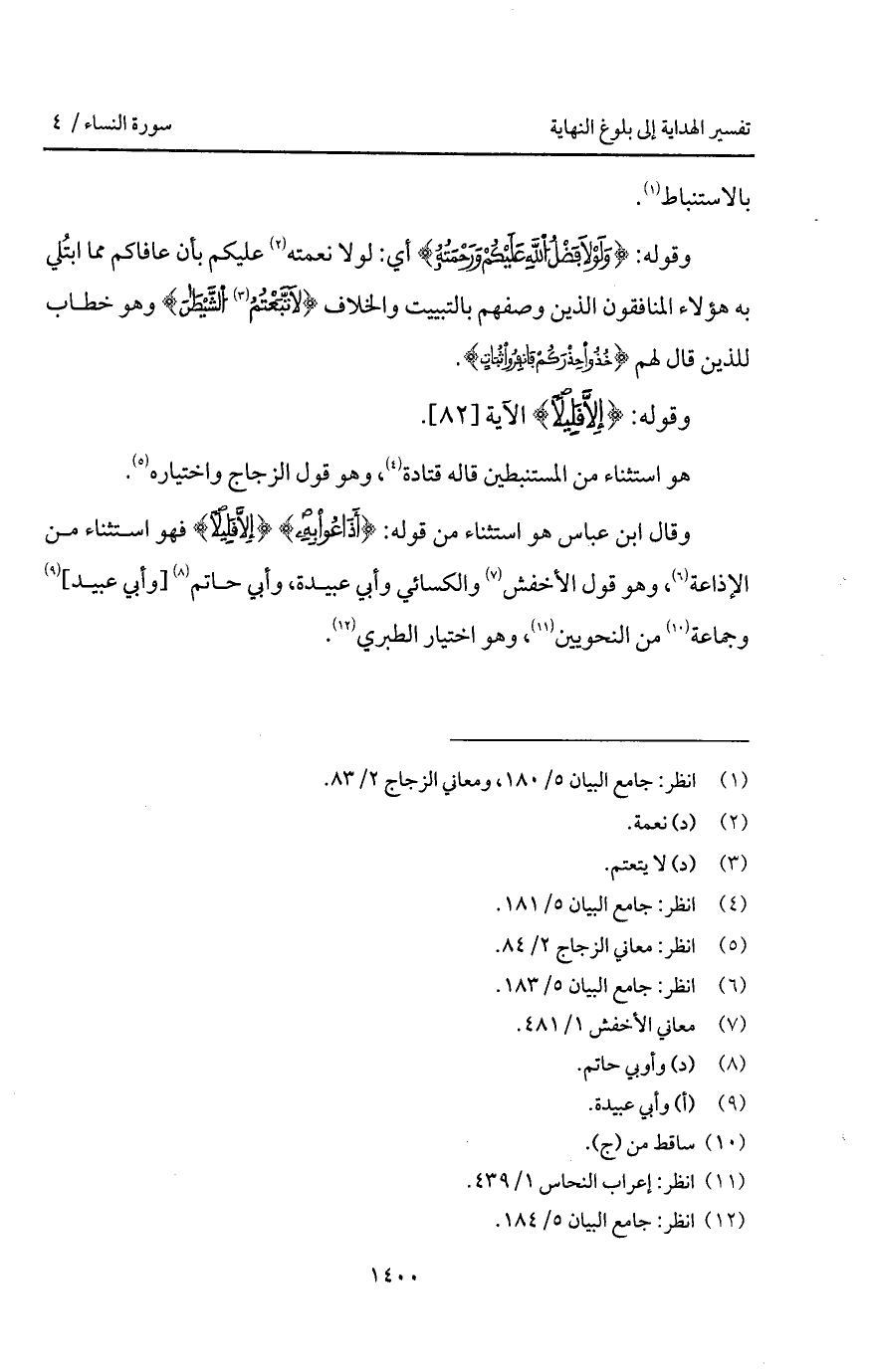 وقال ابن عباس هو استثناء من قوله: {أَذَاعُواْ بِهِ} {إِلاَّ قَلِيلاً} فهو استثناء من الإذاعة، وهو قول الأخفش والكسائي وأبي عبيدة، وأبي حاتم [وأبي عبيد] وجماعة من النحويين، وهو اختيار الطبري.
