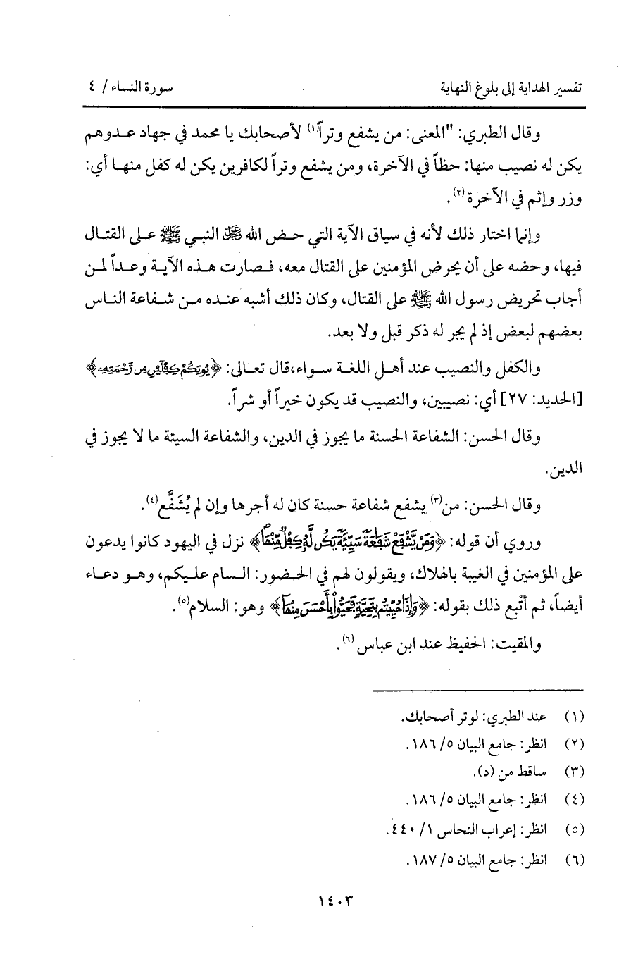 وقال الطبري: " المعنى: من يشفع وتراً لأصحابك يا محمد في جهاد عدوهم يكن له نصيب منها: حظاً في الآخرة، ومن يشفع وتراً لكافرين يكن له كفل منها أي: وزر وإثم في الآخرة.