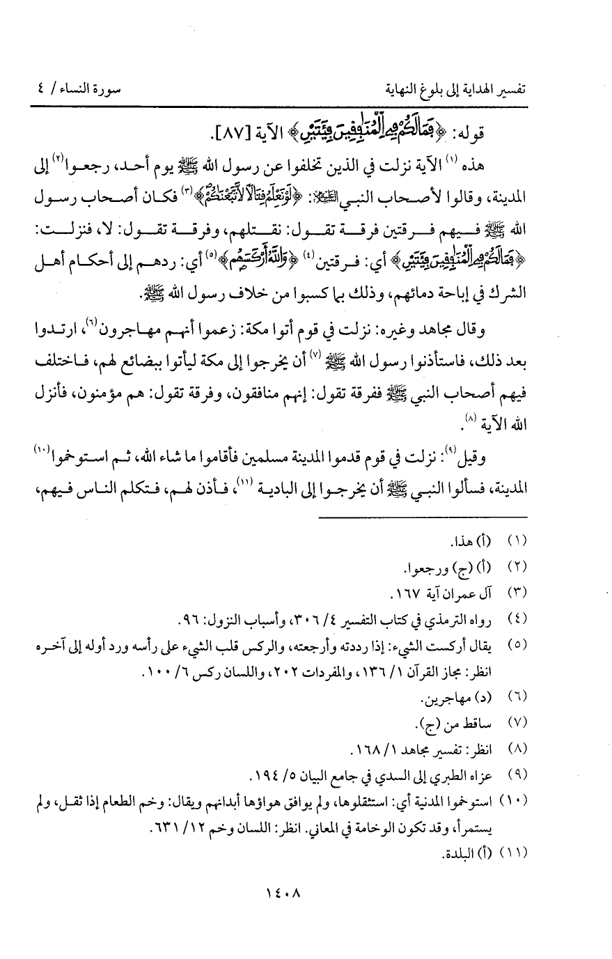 وقيل: نزلت في قوم قدموا المدينة مسلمين فأقاموا ما شاء الله، ثم استوخموا المدينة، فسألوا النبي A أن يخرجوا إلى البادية، فأذن لهم، فتكلم الناس فيهم،
