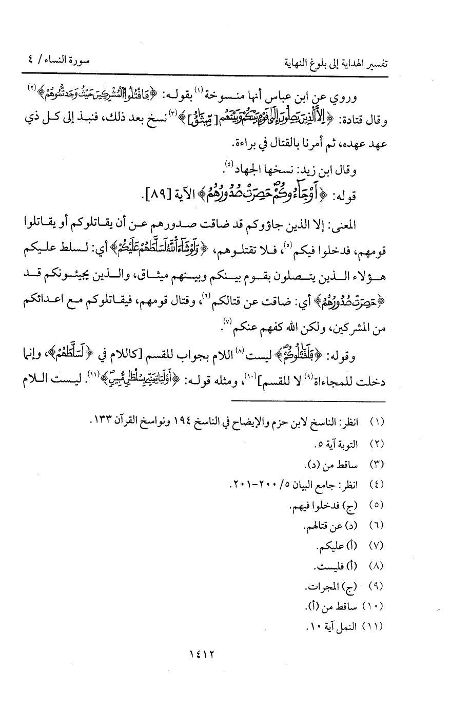 وروي عن ابن عباس أنها منسوخة بقوله: {فاقتلوا المشركين حَيْثُ وَجَدتُّمُوهُمْ} [التوبة: 5] وقال قتادة: {إِلاَّ الذين يَصِلُونَ إلى قَوْمٍ بَيْنَكُمْ وَبَيْنَهُمْ [مِّيثَاقٌ]} نسخ بعد ذلك، فنبذ إلى كل ذي عهد عهده، ثم أمرنا بالقتال في براءة.
