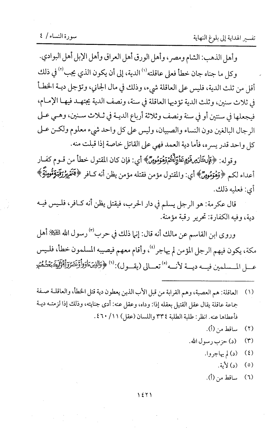 وروي ابن القاسم عن مالك أنه قال: إنما ذلك في حرب رسول الله عليه السلام أهل مكة، يكون فيهم الرجل المؤمن لم يهاجر، وأقام معهم فيصيبه المسلمون خطأ، فليس على المسلمين فيه دية لأنه تعالى (يقول): {والذين آوَواْ ونصروا أولئك بَعْضُهُمْ