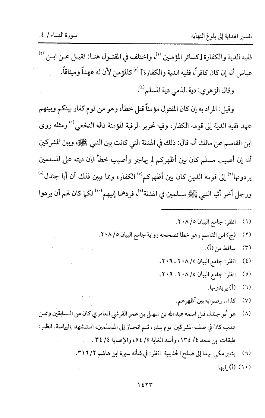 وقيل: المراد به إن كان المقتول مؤمناً قتل خطأ، وهو من قوم كفار بينكم وبينهم عهد ففيه الدية إلى قومه الكفار، وفيه تحرير الرقبة المؤمنة قاله النخعي ومثله روى ابن القاسم عن مالك أنه قال: ذلك في الهدنة التي كانت بين النبي A، وبين المشركين أنه إن أصيب مسلم كان بين أظهركم لم يهاجر وأصيب خطأ فإن ديته على المسلمين يردونها إلى قومه الذين كان بين أظهركم الكفار، ومما يبين ذلك أن أبا جندل ورجل آخر أتيا النبي A مسلمين في الهدنة، فردهما إليهم فكما كان لهم أن يردوا