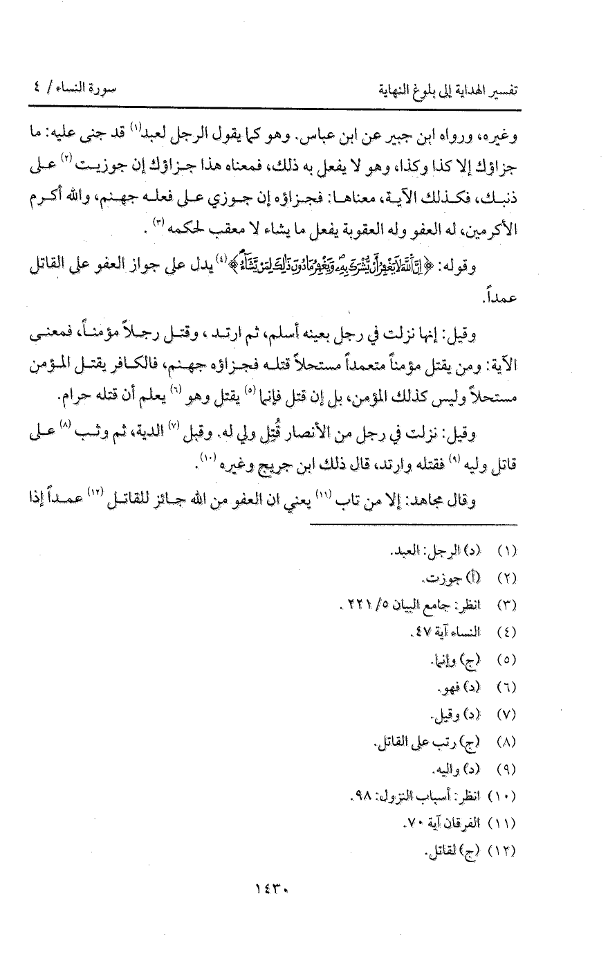وقيل: إنها نزلت في رجل بعينه أسلم، ثم ارتد، وقتل رجلاً مؤمناً، فمعنى الآية: ومن يقتل مؤمناً متعمداً مستحلاً قتله فجزاؤه جهنم، فالكافر يقتل المؤمن مستحلاً وليس كذلك المؤمن، بل إن قتل فإنما يقتل وهو يعلم أن قتله حرام.