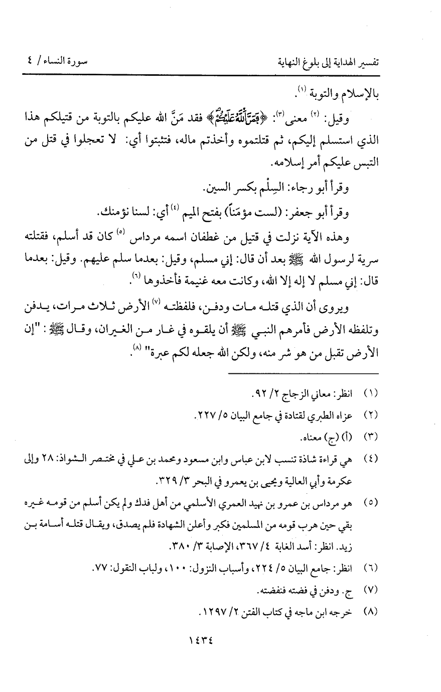 وهذه الآية نزلت في قتيل من غطفان اسمه مرداس كان قد أسلم، فقتلته سرية لرسول الله A بعد أن قال: إني مسلم، وقيل: بعدما سلم عليهم. وقيل: بعدما قال: إني مسلم لا إله إلا الله، وكانت معه غنيمة فأخذوها.