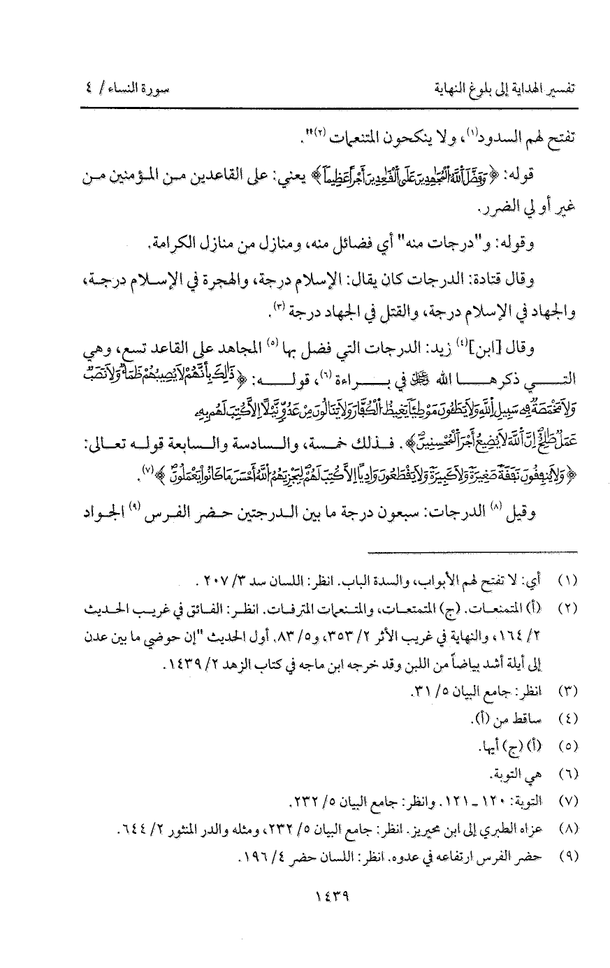 وقال [ابن] زيد: الدرجات التي فضل بها المجاهد على القاعد تسع، وهي التي ذكرها الله D في براءة، قوله: {ذلك بِأَنَّهُمْ لاَ يُصِيبُهُمْ ظَمَأٌ وَلاَ نَصَبٌ وَلاَ مَخْمَصَةٌ فِي سَبِيلِ الله وَلاَ يَطَأُونَ مَوْطِئاً يَغِيظُ الكفار وَلاَ يَنَالُونَ مِنْ عَدُوٍّ نَّيْلاً إِلاَّ كُتِبَ لَهُمْ بِهِ عَمَلٌ صَالِحٌ إِنَّ الله لاَ يُضِيعُ أَجْرَ المحسنين} [التوبة: 120]. فذلك خمسة، والسادسة والسابعة قوله تعالى: {وَلاَ يُنفِقُونَ نَفَقَةً صَغِيرَةً وَلاَ كَبِيرَةً وَلاَ يَقْطَعُونَ وَادِياً إِلاَّ كُتِبَ لَهُمْ لِيَجْزِيَهُمُ الله أَحْسَنَ مَا كَانُواْ يَعْمَلُونَ} [التوبة: 121].