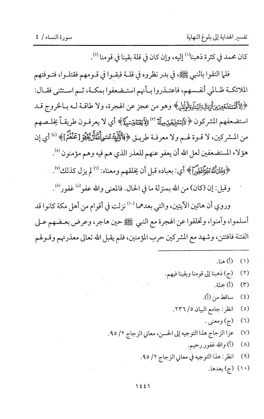 فلما التقوا بالنبي A، في بدر نظروه في قلة فبقوا في قومهم فقتلوا، فتوفتهم الملائكة ظالمي أنفسهم، فاعتذروا بأنهم استضعفوا بمكة، ثم استثنى فقال: {إِلاَّ المستضعفين مِنَ الرجال والنسآء والولدان} وهو من عجز عن الهجرة، ولا طاقة له بالخروج قد استضعفهم المشركون {لاَ يَسْتَطِيعُونَ حِيلَةً وَلاَ يَهْتَدُونَ سَبِيلاً} أي لا يعرفون طريقاً يخلصهم من المشركين، لا قوة لهم ولا معرفة طريق {فأولئك عَسَى الله أَن يَعْفُوَ [عَنْهُمْ]} أي إن هؤلاء المستضعفين لعل الله أن يعفو عنهم للعذر الذي هم فيه وهم مؤمنون.