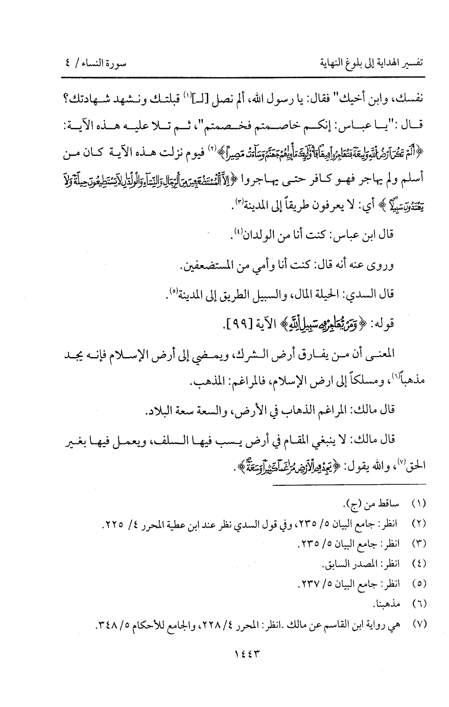 نفسك، وابن أخيك " فقال: يا رسول الله، ألم نصل [ل] قبلتك ونشهد شهادتك؟ قال: " يا عباس: إنكم خاصمتم فخصمتم "، ثم تلا عليه هذه الآية: {أَلَمْ تَكُنْ أَرْضُ الله وَاسِعَةً فَتُهَاجِرُواْ فِيهَا فأولئك مَأْوَاهُمْ جَهَنَّمُ وَسَآءَتْ مَصِيراً} " فيوم نزلت هذه الآية كان من أسلم ولم يهاجر فهو كافر حتى يهاجروا {إِلاَّ المستضعفين مِنَ الرجال والنسآء والولدان لاَ يَسْتَطِيعُونَ حِيلَةً وَلاَ يَهْتَدُونَ سَبِيلاً} أي: لا يعرفون طريقاً إلى المدينة.