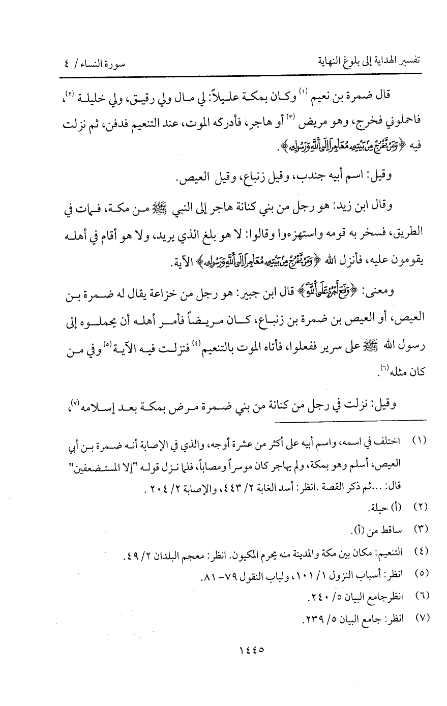 قال ضمرة بن نعيم وكان بمكة عليلاً: لي مال ولي رقيق، ولي خليلة، فاحملوني فخرج، وهو مريض أو هاجر، فأدركه الموت، عند التنعيم فدفن، ثم نزلت فيه {وَمَن يَخْرُجْ مِن بَيْتِهِ مُهَاجِراً إِلَى الله وَرَسُولِهِ}.