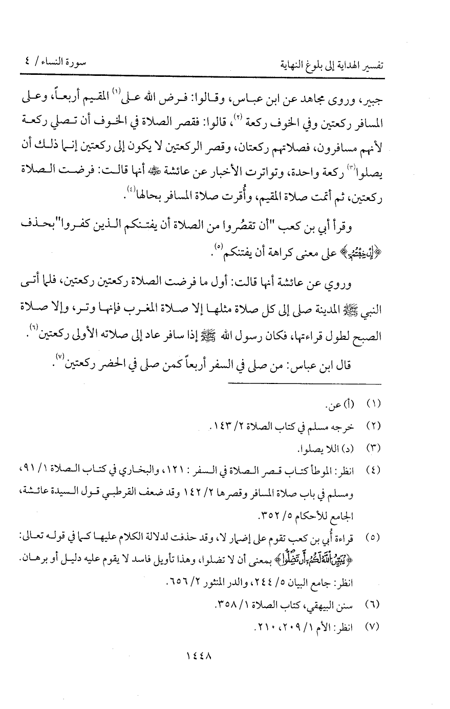 جبير، وروى مجاهد عن ابن عباس، وقالوا: فرض الله على المقيم أربعاً، وعلى المسافر ركعتين وفي الخوف الخوف ركعة، قالوا: فقصر الصلاة في الخوف أن تصلي ركعة لأنهم مسافرون، فصلاتهم ركعتان، وقصر الركعيتن لا يكون إلى ركعتين إنما ذلك أن يصلوا ركعة واحدة، وتواترت الأخبار عن عائشة Bها أنه قالت: فرضت الصلاة ركعتين، ثم أتمت صلاة المقيم، وأُقرت صلاة المسافر بحالها.