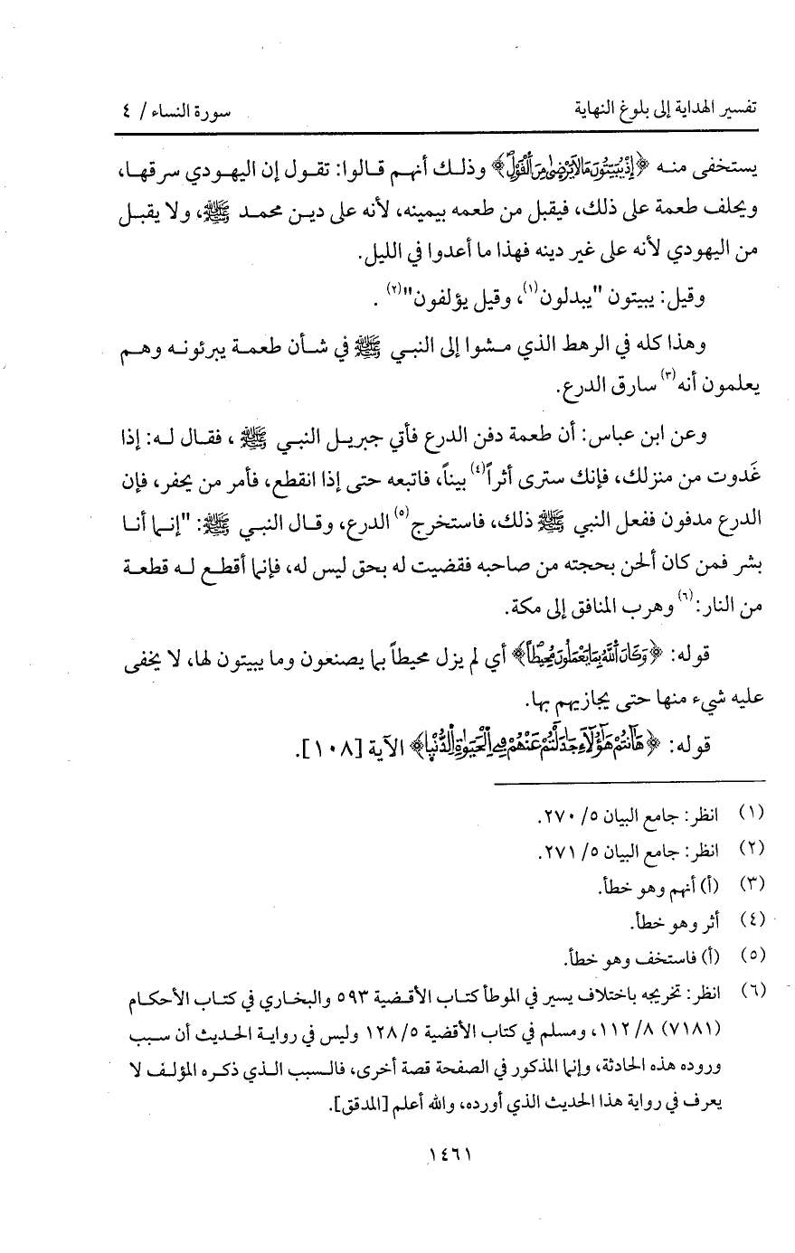 وعن ابن عباس: " أن طعمة دفن الدرع فأتي جبريل النبي A، فقال له: إذا غَدوت من منزلك، فإنك سترى أثراً بيناً، فاتبعه حتى إذا انقطع، فأمر من يحفر، فإن الدرع مدفون ففعل النبي A ذلك، فاستخرج الدرع، وقال النبي A: " إنما أنا بشر فمن كان ألحن بحجته من صاحبه فقضيت له بحق ليس له، فإنما أقطع له قطعة من النار: وهرب المنافق إلى مكة ".
