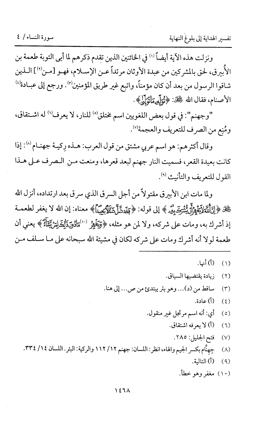 ولما مات ابن الأبيرق مقتولاً من أجل السرق الذي سرق بعد ارتداده، أنزل الله D { إِنَّ الله لاَ يَغْفِرُ أَن يُشْرَكَ بِهِ} إلى قوله: {فَقَدْ ضَلَّ ضَلاَلاً بَعِيداً} معناه: إن الله لا يغفر لطعمة إذ أشرك به، ومات على شركه، ولا لمن هو مثله، {وَيَغْفِرُ مَا دُونَ ذلك لِمَن يَشَآءُ} يعني أن طعمة لولا أنه أشرك ومات على شركه لكان في مشيئة الله سبحانه على ما سلف من