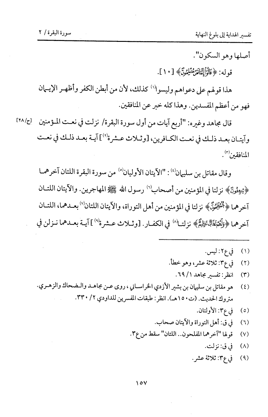 وقال مقاتل بن سليمان: " الآيتان الأوليان من سورة البقرة اللتان آخرهما {يُنْفِقُونَ} نزلتا في المؤمنين من أصحاب رسول الله A المهاجرين. والآيتان اللتان آخرهما {المفلحون} نزلتا في المؤمنين من أهل التوراة، والآيتان اللتان بعدهما، اللتان آخرهما {وَلَهُمْ عَذَابٌ عظِيمٌ} نزلتا في الكفار. [وثلاث عشرة] آية بعدهما نزلن في