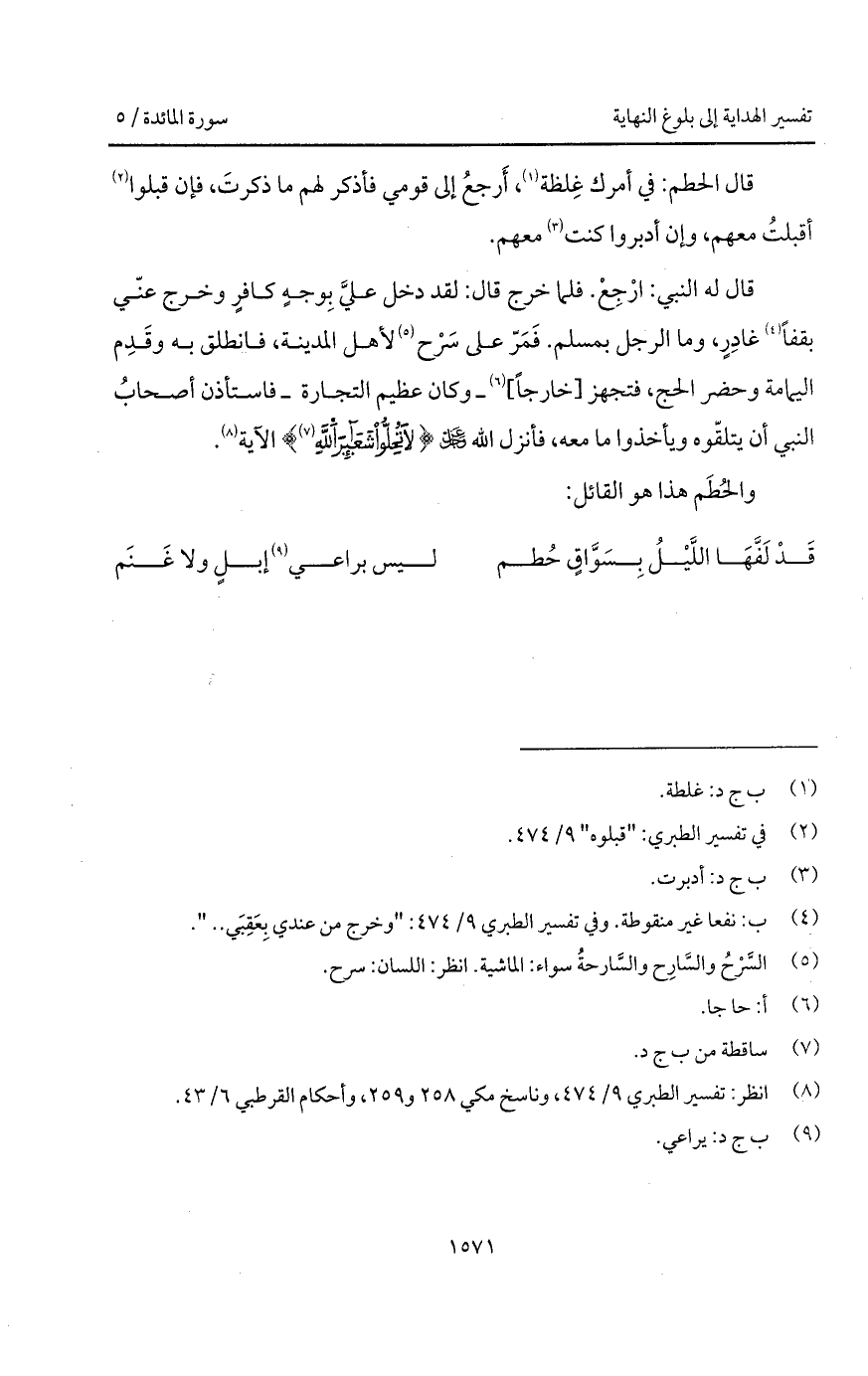 قال له النبي: ارْجِعْ. فلما خرج قال: لقد دخل عليَّ بِوجهٍ كافرٍ وخرج عنّي بقفاً غادِرٍ، وما الرجل بمسلم. فَمَرّ على سَرْح لأهل المدينة، فانطلق به وقَدِم اليمامة وحضر الحج، فتجهز [خارجاً]- وكان عظيم التجارة - فاستأذن أصحابُ النبي أن يتلقّوه ويأخذوا ما معه "، فأنزل الله D { لاَ تُحِلُّواْ شَعَآئِرَ الله} الآية.