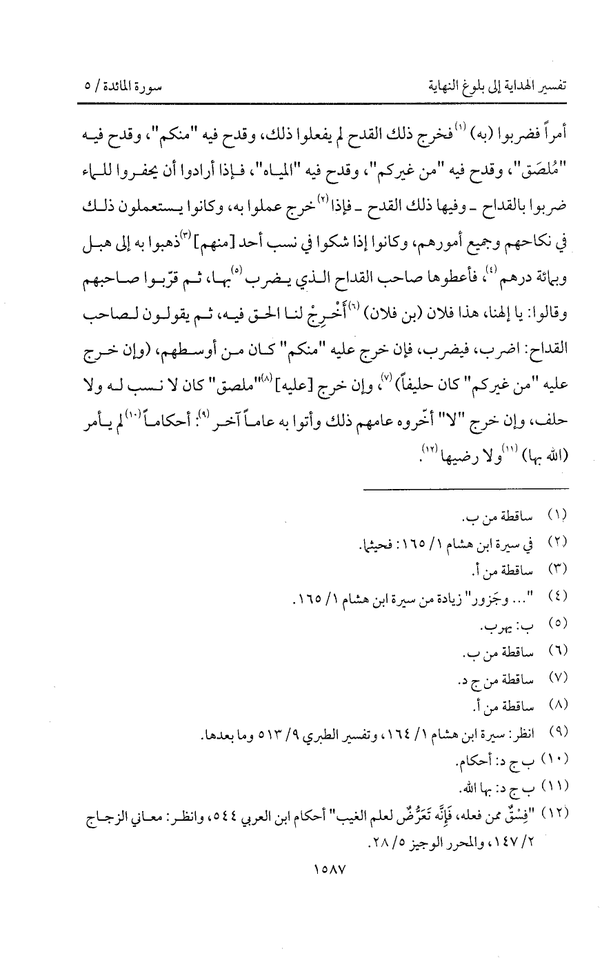 أمراً فضربوا (به) فخرج ذلك القدح لم يفعلوا ذلك، وقدح فيه " منكم "، وقدح فيه " مُلصَق "، وقدح فيه " من غيركم "، وقدح فيه " المياه "، فإذا أرادوا أن يحفروا للماء ضربوا بالقداح - وفيها ذلك القدح - فإذا خرج عملوا به، وكانوا يستعملون ذلك في نكاحهم وجميع أمورهم، وكانوا إذا شكوا في نسب أحد [منهم] ذهبوا به إلى هبل وبمائة درهم، فأعطوها صاحب القداح الذي يضرب بها، ثم قرّبوا صاحبهم وقالوا: يا إلهنا، هذا فلان (بن فلان) أَخْرِجْ لنا الحق فيه، ثم يقولون لصاحب القداح: اضرب، فيضرب، فإن خرج عليه " منكم " كان من أوسطهم، (وإن خرج عليه " من غيركم " كان حليفاً)، وإن خرج [عليه] " ملصق " كان لا نسب له ولا حلف، وإن خرج " لا " أخّروه عامهم ذلك وأتوا به عاماً آخر: أحكاماً لم يأمر (الله بها) ولا رضيها.