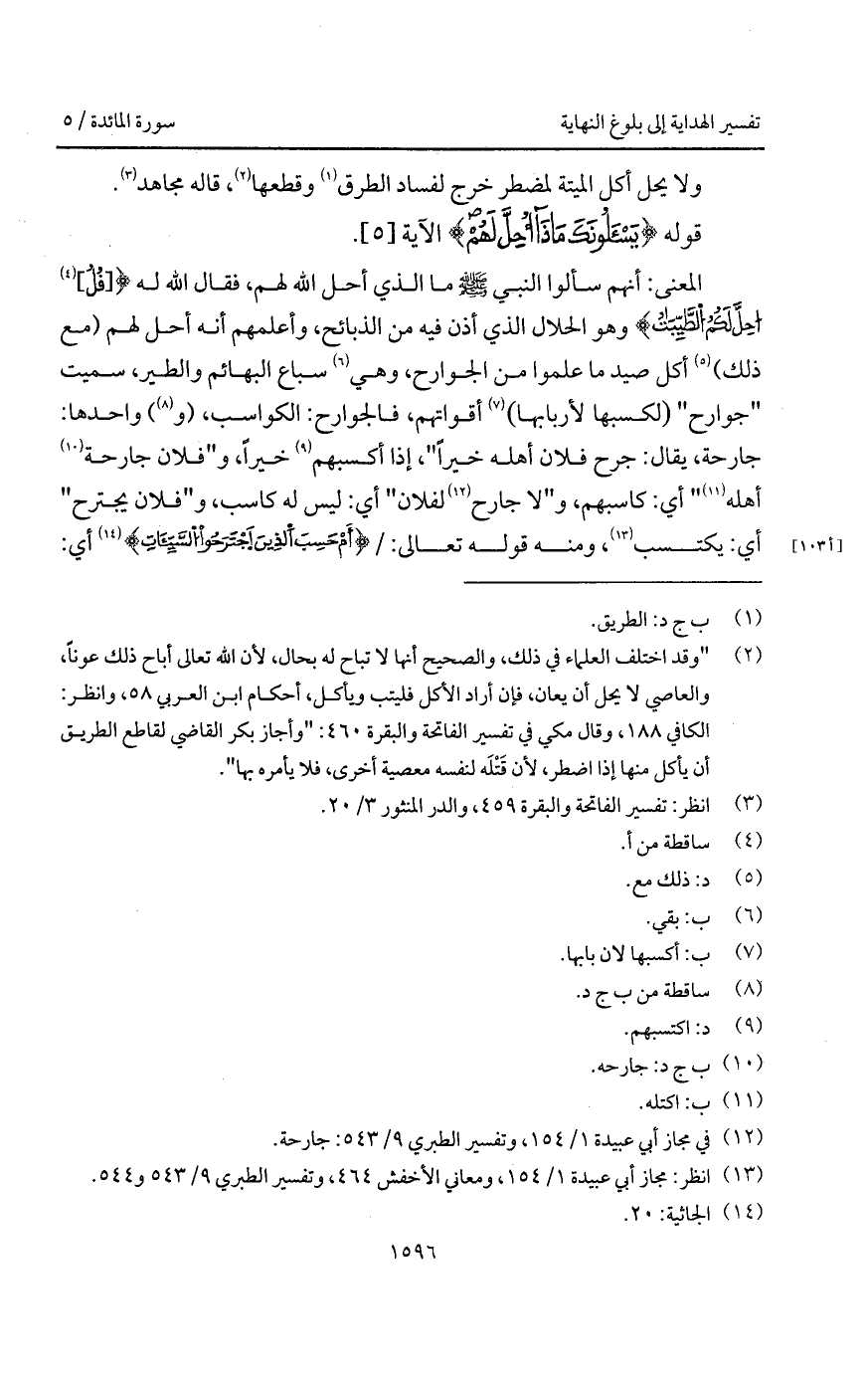المعنى: أنهم سألوا النبي A ما الذي أحل الله لهم، فقال الله له {[قُلْ] أُحِلَّ لَكُمُ الطيبات} وهو الحلال الذي أذن فيه من الذبائح، وأعلمهم أنه أحل لهم (مع ذلك) أكل صيد ما علموا من الجوارح، وهي سباع البهائم والطير، سميت " جوارح " (لكسبها لأربابها) أقواتهم، فالجوارح: الكواسب، (و) واحدها: جارحة يقال: جرح فلان أهله خيراً "، إذا أكسبهم خيراً، و " فلان جارحة أهله " أي: كاسبهم، و " لا جارح لفلان " أي: ليس له كاسب، و " فلان يجترح " أي: يكتسب، ومنه قوله تعالى: / {أَمْ حَسِبَ الذين اجترحوا السيئات} [الجاثية: 21] أي: