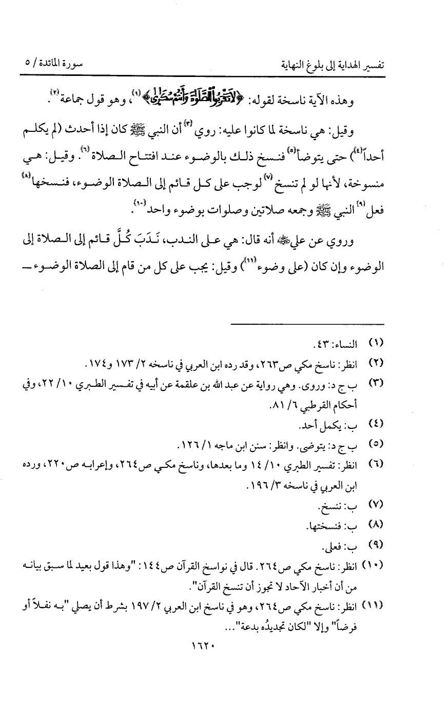 وقيل: هي ناسخة لما كانوا عليه: روي " أن النبي A كان إذا أحدث (لم يكلم أحداً) حتى يتوضأ فنسخ ذلك بالوضوء عند افتتاح الصلاة " وقيل: هي منسوخة، لأنها لو لم تنسخ لوجب على كل قائم إلى الصلاة الوضوء، فنسخها فعل النبي A وجمعه صلاتين وصلوات بوضوء واحد.